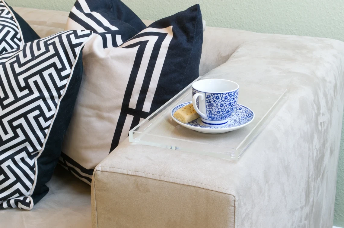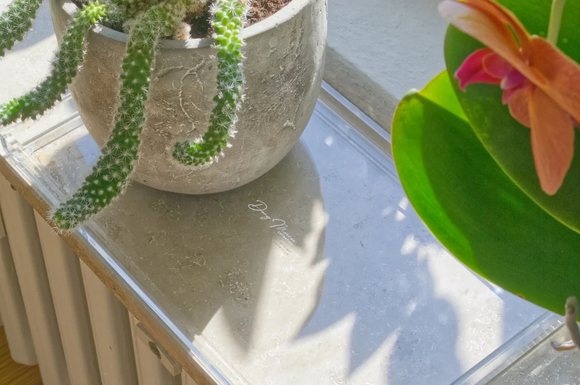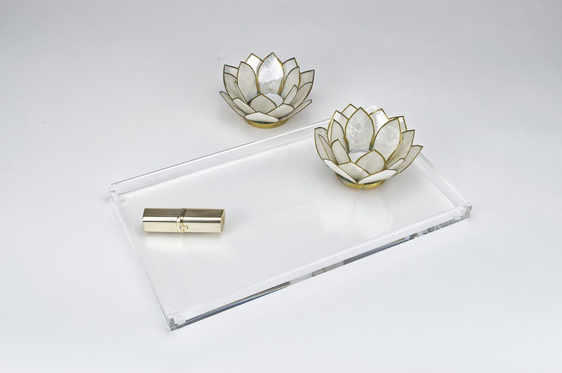 This elegant tray can become your universal companion. Whether on the desk, in the living room or on your nightstand, it offers many possibilities to create order or protect furniture. Store jewelry or cosmetics on it, bring structure to your desk, and collect and organize pens, clips or accessories on it. Enjoy your coffee or tea, but protect your furniture from scratches and stains by placing cups or glasses on this modern and understated tray. In contemporary design is made of high quality acrylic. Our tray is available with noble gold rim or completely transparent