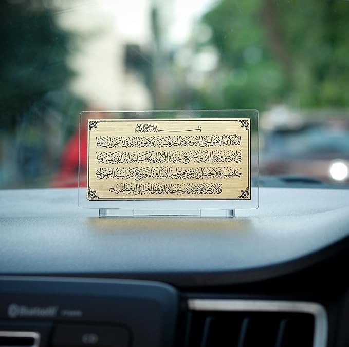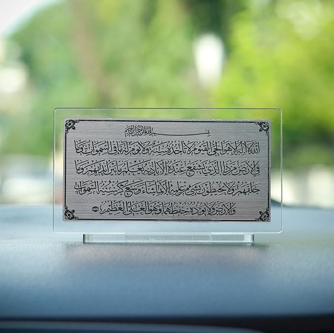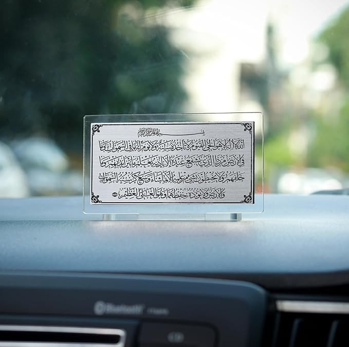 2. AYATUL KURSI & ISLAMIC SYMBOLS: Features the revered Ayatul Kursi along with Allah and Muhammad symbols, offering a spiritually enriching decor piece for your car, home, or office.