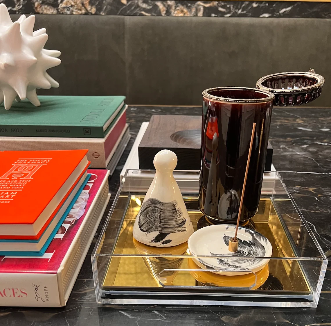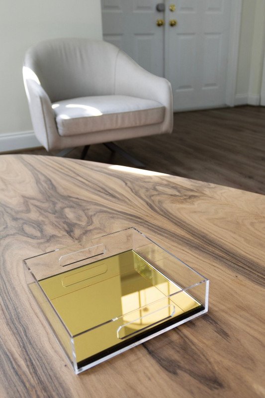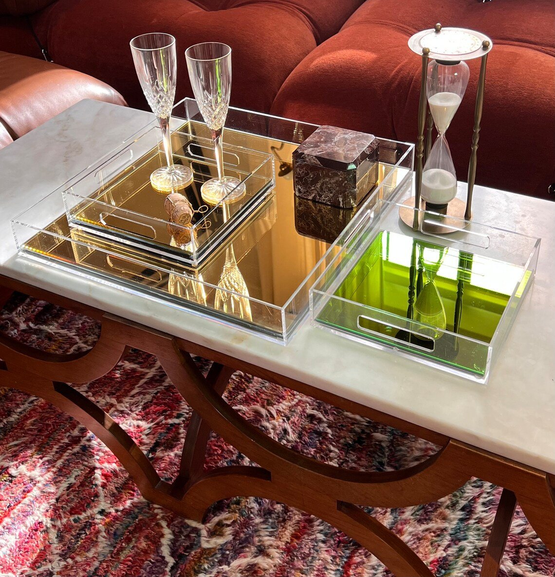 The Handmade acrylic tray mirror is born with a natural eye and talent for design, is evident for the complexities of glass, texture, and technology; fascination for creating timeless tray, that are classic, yet perfectly on-trend. Their design philosophy combines timeless elegance with modern edgy chic. A tray is just a tray until it reflects the love it was made from. By hand, carefully stained; smoked mirrors are used to ground the precise execution cut plexiglass.The handles are designed with a detailed edge to complete the square frame.Sized for ergonomic ease; the look is timeless.